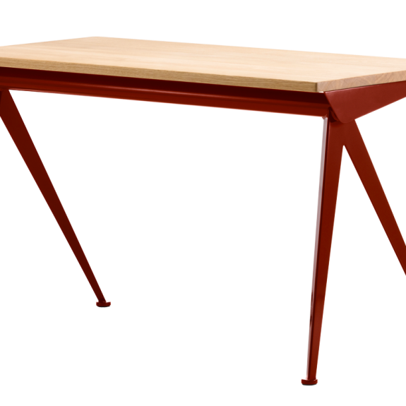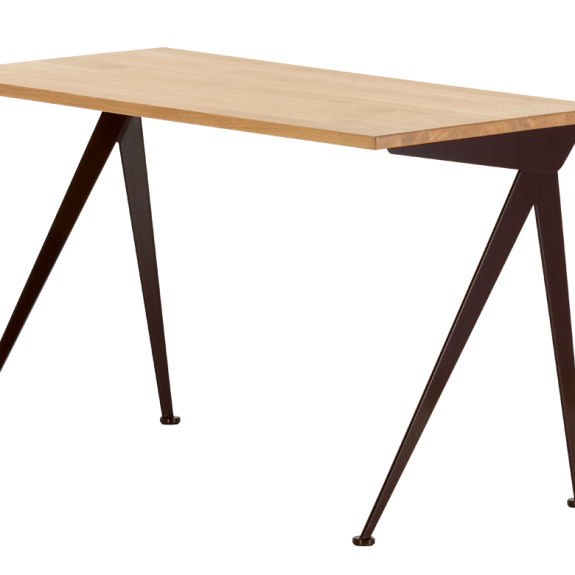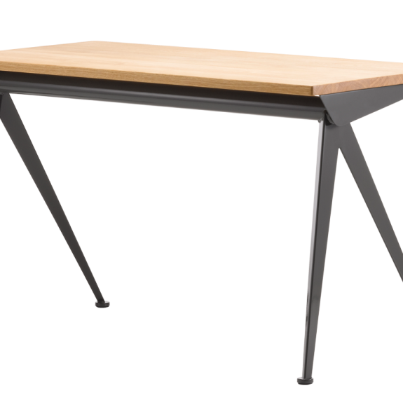 Mesa con esbeltas patas metálicas, elegantemente separadas de la mesa Compas Direction de Jean Prouvé recuerdan los brazos de un compás: “le compas” en francés. Su diseño está basado en principios de ingeniería que representan el modelo estructural del ingeniero y diseñador francés. Junto con los tableros de madera maciza tratada al aceite, forman una mezcla de materiales de gran contraste en la oficina doméstica.