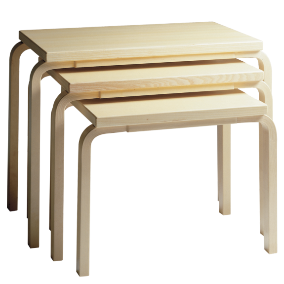 Este trío de tablas de anidamiento puede servir como mesas auxiliares, mesas de café, o se pueden usar de forma individual, distribuidas en una habitación para proporcionar múltiples superficies de mesas. Las patas de abedul macizas están confeccionadas con la técnica L-leg de Alvar Aalto, mientras que las mesas están compuestas por tableros de partículas con una capa de abedul, lo que hace que las mesas sean livianas y fáciles de mover. Cuando no están en uso, las mesas se anidan perfectamente, ahorrando espacio al tiempo que crean un rompecabezas geométrico llamativo.