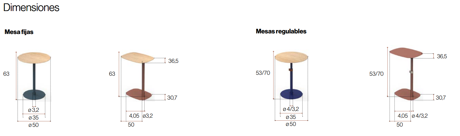 Cubierta rectangular de 50x36 o redonda diam 50. MDF Lacadas de color o Madera Roble.