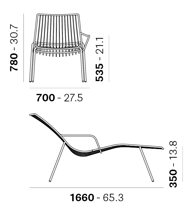 Nolita es una familia de sillas y sillones de exterior que evoca los orígenes de un recorrido histórico iniciado por Mario Pedrali en 1963 con sus primeras sillas metálicas de jardín. Chaise longue con estructura de tubo de acero pintado para exteriores.