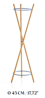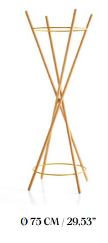 Cuenta con bastones de madera maciza disponibles en haya o roble con un diámetro de 30 mm y una longitud de 1940 mm. Sus aros de varilla de acero de 11 mm de diámetro se encuentran en diferentes acabados. Puedes colgar tus prendas en la terminación de sus listones o agregar discretos ganchos. Perfecto para espacios públicos, oficinas u hogares.