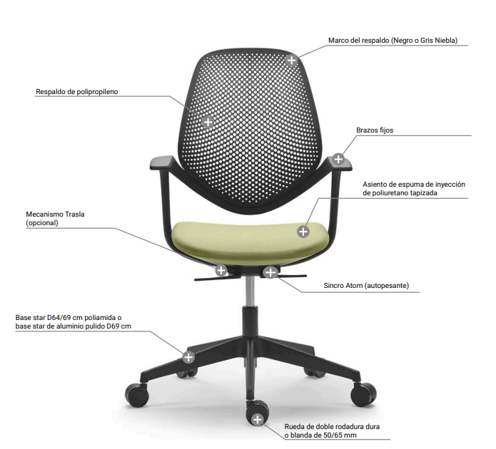 ASIENTO: Formado por una carcasa estructural de de polipropileno, texturizada por la parte exterior, que sirve de soporte para la espuma de poliuretano inyectada de 62kg/m3 y tapizada con platabanda. Dicha platabanda, que marca el contorno del asiento, irá tapizada con el mismo tejido que la zona superior del asiento.El asiento dispone como opción un sistema que permite regular la profundidad de este en 5 cm.Ofrecemos la opción de color negro y blanco.