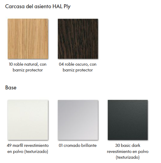 Las distintas bases de las sillas se pueden combinar con una carcasa de asiento de plástico (HAL y HAL RE), de madera contrachapada (HAL Ply) o con una carcasa ligeramente acolchada y revestida de tela (HAL Soft).