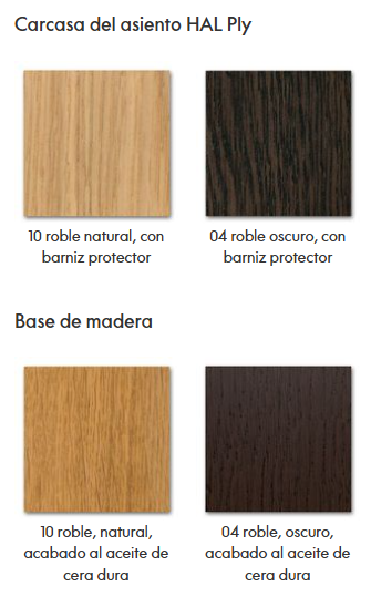 Las distintas bases de las sillas se pueden combinar con una carcasa de asiento de plástico (HAL y HAL RE), de madera contrachapada (HAL Ply) o con una carcasa ligeramente acolchada y revestida de tela (HAL Soft).