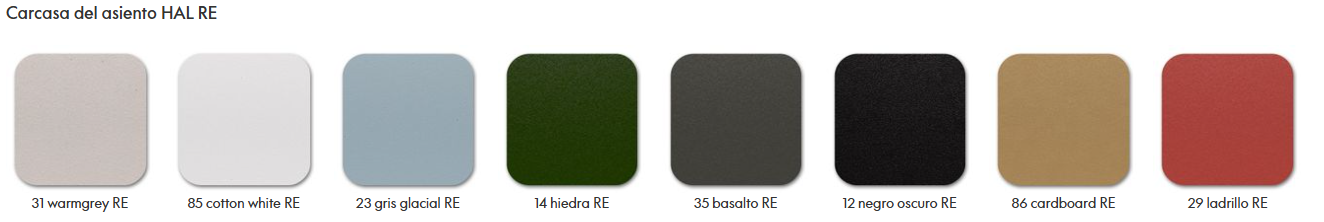 Debido a la composición del material reciclado, los distintos colores están salpicados con pequeñas motas de pigmento. Por el momento, en el nuevo material no se puede implementar el color blanco, pero se hará tan pronto como sea técnicamente posible. La carcasa de asiento de HAL RE también se puede reciclar al 100 % al final de la vida útil del producto.