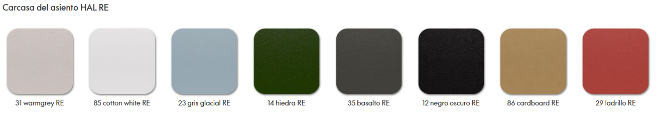 Las distintas bases de las sillas se pueden combinar con una carcasa de asiento de plástico (HAL y HAL RE), de madera contrachapada (HAL Ply) o con una carcasa ligeramente acolchada y revestida de tela (HAL Soft).