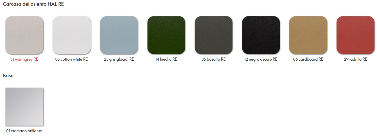 Las distintas bases de las sillas se pueden combinar con una carcasa de asiento de plástico (HAL y HAL RE), de madera contrachapada (HAL Ply) o con una carcasa ligeramente acolchada y revestida de tela (HAL Soft).