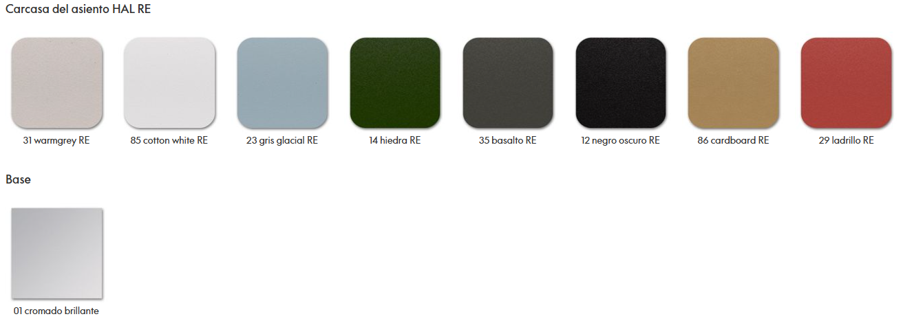 Las distintas bases de las sillas se pueden combinar con una carcasa de asiento de plástico (HAL y HAL RE), de madera contrachapada (HAL Ply) o con una carcasa ligeramente acolchada y revestida de tela (HAL Soft).