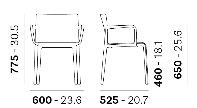 Silla con brazos, apilable. Uso interior y exterior.