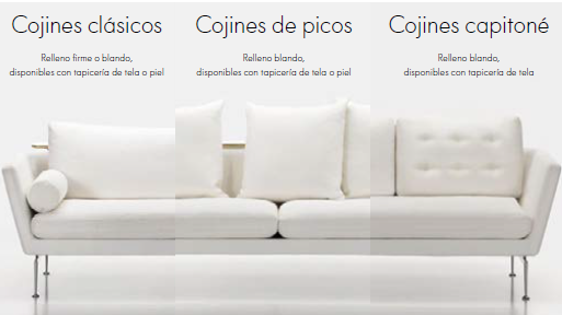 de mobiliario. Los cojines del asiento y el respaldo pueden elegirse en versión blanda o firme y, opcionalmente, con capitoné.