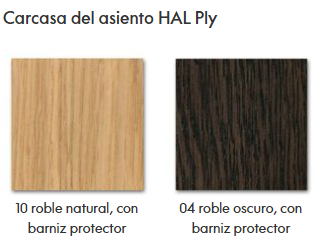 Las distintas bases de las sillas se pueden combinar con una carcasa de asiento de plástico (HAL y HAL RE), de madera contrachapada (HAL Ply) o con una carcasa ligeramente acolchada y revestida de tela (HAL Soft).