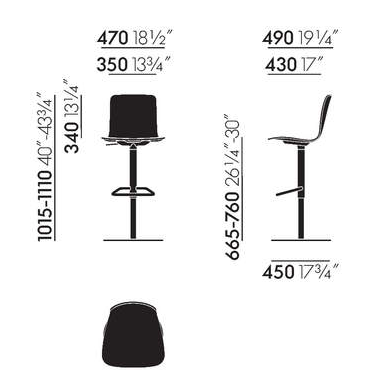 • Base:  pedestal de acero tubular de altura ajustable, elevación por gas, revestimiento en polvo en color basic dark, manguito de columna y reposapiés de acero tubular cromado con superficie antideslizante. El elemento de conexión entre la carcasa y la base es de aluminio fundido revestido en polvo de color dim grey. Placa de base de acero con cubierta de acero inoxidable pulido (mate); parte inferior de fieltro.