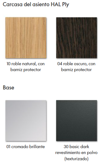 Las distintas bases de las sillas se pueden combinar con una carcasa de asiento de plástico (HAL y HAL RE), de madera contrachapada (HAL Ply) o con una carcasa ligeramente acolchada y revestida de tela (HAL Soft).