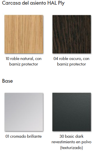 Las distintas bases de las sillas se pueden combinar con una carcasa de asiento de plástico (HAL y HAL RE), de madera contrachapada (HAL Ply) o con una carcasa ligeramente acolchada y revestida de tela (HAL Soft).