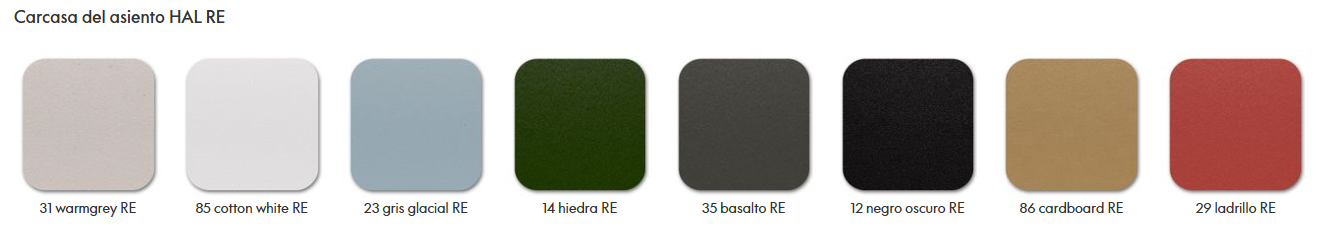 Debido a la composición del material reciclado, los distintos colores están salpicados con pequeñas motas de pigmento. Por el momento, en el nuevo material no se puede implementar el color blanco, pero se hará tan pronto como sea técnicamente posible. La carcasa de asiento de HAL RE también se puede reciclar al 100 % al final de la vida útil del producto.