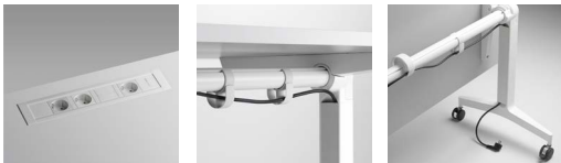 Un programa de mesas que ofrece soluciones orientadas a la flexibilidad, a la productividad y a la polivalencia, debe tener en cuanta la integración de las nuevas tecnologías. Travel dispone de un schuko opcional integrado en la tapa de la mesa y unas piezas que conducen el cableado a través de la viga para llegar al pedestal que presenta un hueco destinado a la conducción vertical de la electrificación. Este sistema permite enlazar la electrificación de diferentes mesas.